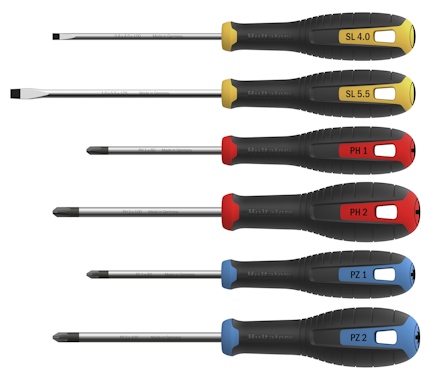 Set med 3 av de vanligaste typerna av skruvmejslar, utvecklade för professionellt bruk tillsammans med hantverkare. Innehåller PH 1 och 2, PZ 1 och 2 samt spårskruvmejsel 4 och 5,5. Läs mer