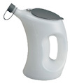 Transparant oljemått i plast med lock för påfyllningshål och pip.