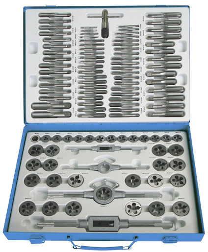 Sats om 110 delar. Innehåller två svängjärn för runda gängsnitt, 2 ställbara svängjärn för gängtappar och en gängtappshållare.
