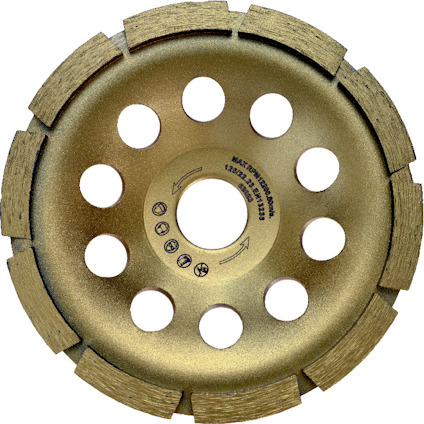 Diamantslipskål Germaflex. Diamantslipskål för att slipa, forma och polera olika särskilt hårda material som betong, keramik, och natursten. Innehåller diamantkorn som ger en effektiv slipning och lång livslängd. Diamantskål: 1R = på diamantslipskålar innebär 1 rad av diamantkorn. Fördelen med 1R är att den ger mjukare slipning, längre livslängd, bättre finish och mindre risk för överhettning, idealisk för noggranna ytbehandlingar och/eller polering av material. 2R =  innebär att slipskålen har två rader av diamantkorn. Denna design ger en mer aggressiv slipning jämfört med 1R. 2R-slipskålar tar effektivt bort material och formar ytor, idealiska för tung bearbetning av hårda material som betong och natursten. Turbo = betyder en speciell design som har ett förbättrat flöde av kylning och mindre motstånd under slipning. Detta gör att slipskålen arbetar mer effektivt och avleder värme effektivt vilket ger en bättre ytfinish. Turbo-diskar är utformade för att användas på hårda material som betong och natursten. TW = Turbo Wheel och är en typ av diamantslipskålar som är designade för att ge en ännu snabbare och effektivare slipprocess än Turbodisken, med en mer aggressiv slipning. Turbo Wheel-diskar har en speciell struktur av diamantkorn som förbättrar avledningen av värme och materialborttagning, vilket gör dem lämpliga för slipning av hårda material som betong, sten och keramik.