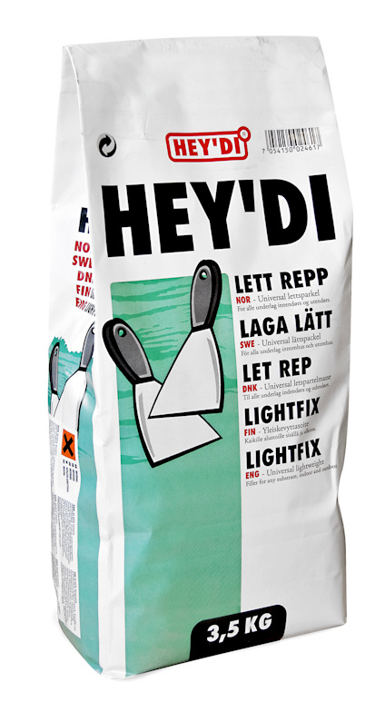 Heydi Laga Lätt 3,5 kg är en lättspackel, "allt-i-ett" reparations- och spackelmassa som har många användningsområden. En "allt-i-ett" reparations- och spackelmassa som har många användningsområden. Heydi Laga Lätt är enkel att påföra, har god vidhäftning till underlaget och kan påföras i tjocka skikt utan att massan rör sig eller spricker. Används både inne och ute på alla underlag, murar, betong, trä, gips - väggar - golv - tak. Ger bra skruvoch spikfäste.
